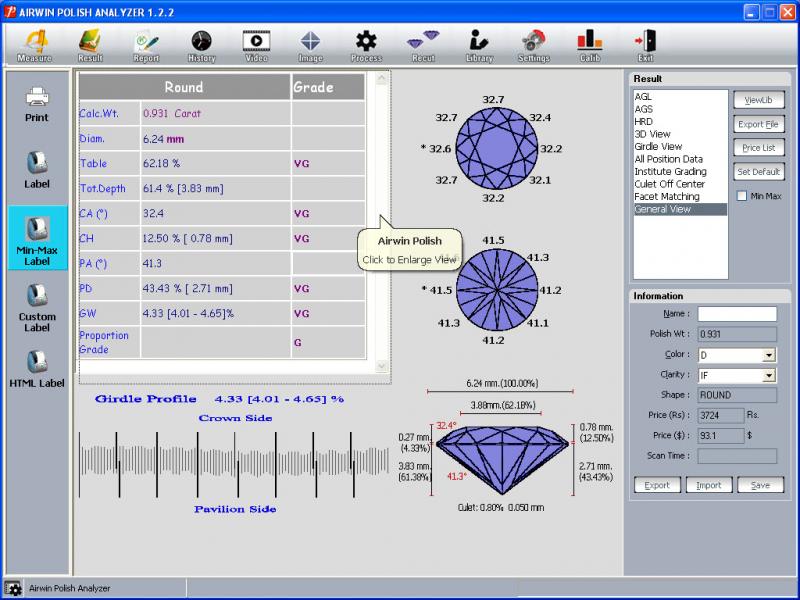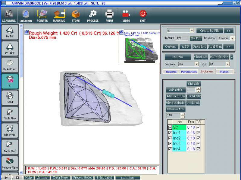 Airwin Diagnose is a software application for scanning and measurement of rough diamonds. Rough diamonds are measured using video capturing and image processing and 3D object is generated and displayed using OpenGL. The various parameters of the diamond can be measured using 3D object of the diamond.