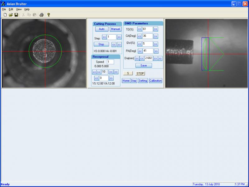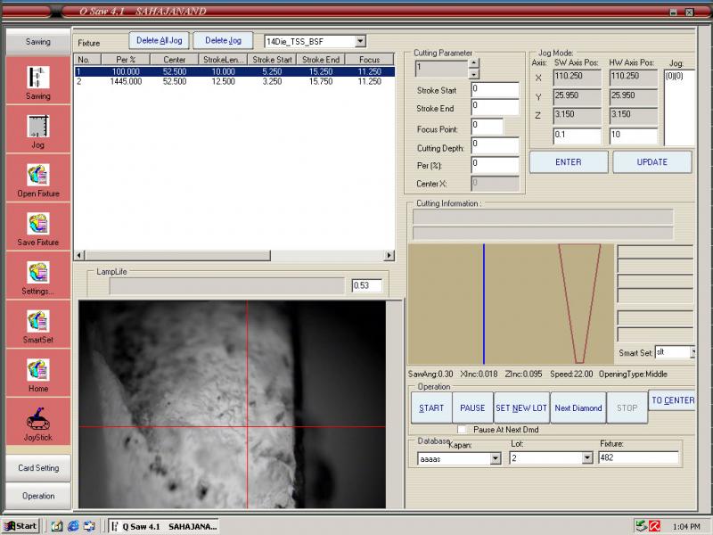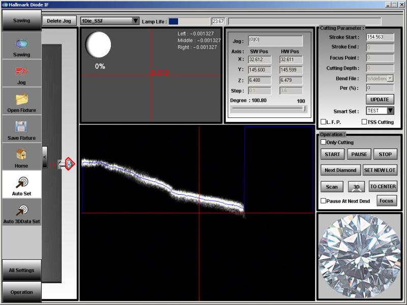 This application is for cutting the diamond in two pieces using the Laser. Cutting is done with the help of servo and stepper motors which is controlled by Ethernet and USB Controller. Capturing the live video and process its frame after grabbing is used for some automation. Saving and retrieving of data is done by MSAccess.